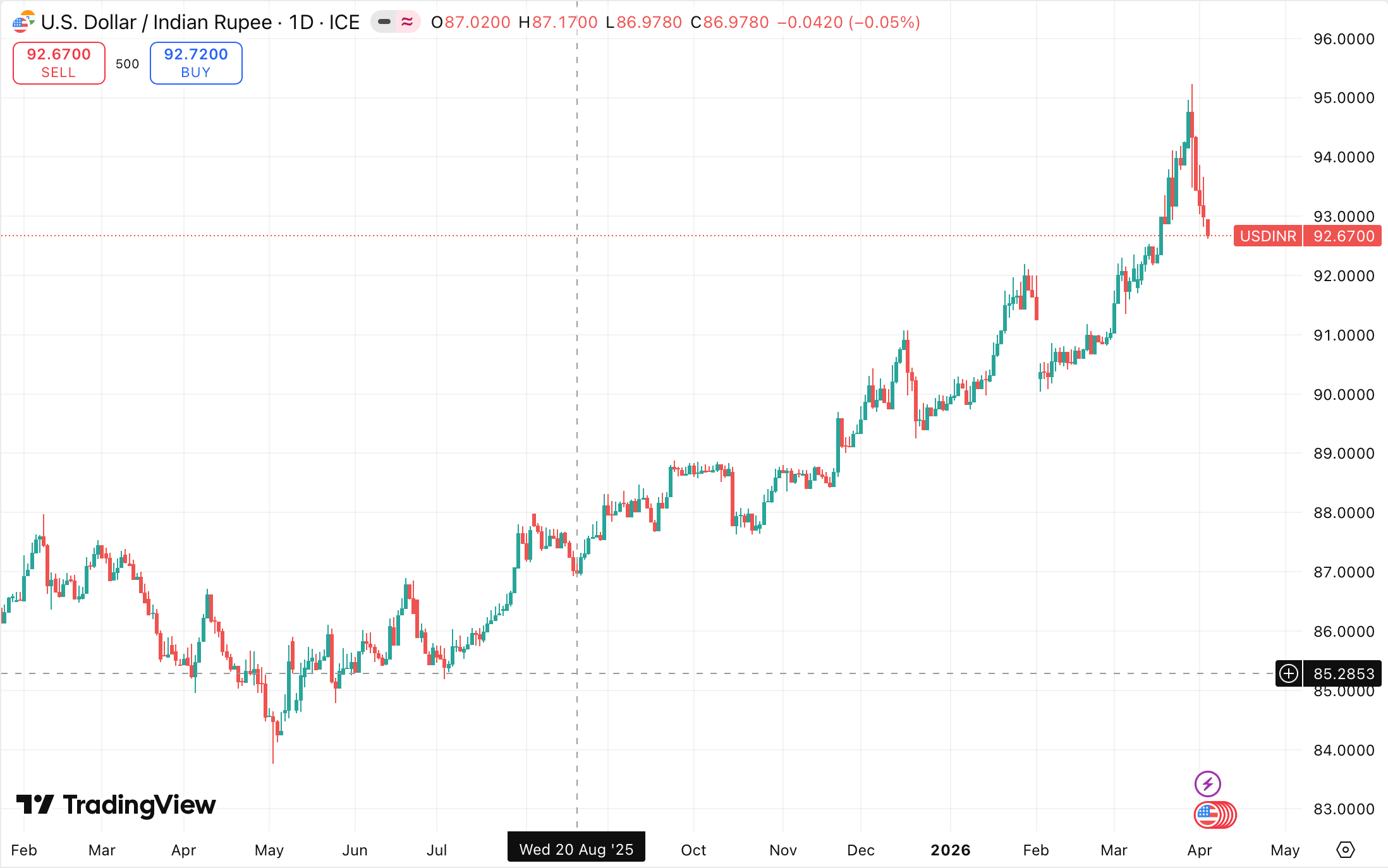 Amid all this geopolitical turmoil INR has taken a severe beating. Persistent capital outflows, fear of sky-high inflation due to rising crude prices has pushed the INR to the extreme corner – breaching the 95 mark for the first time against the USD. FY26 has been the worst in a decade for INR.