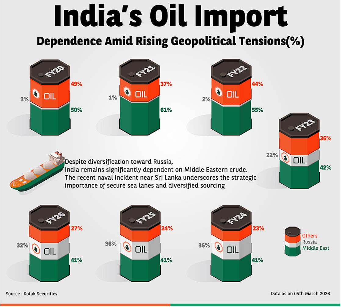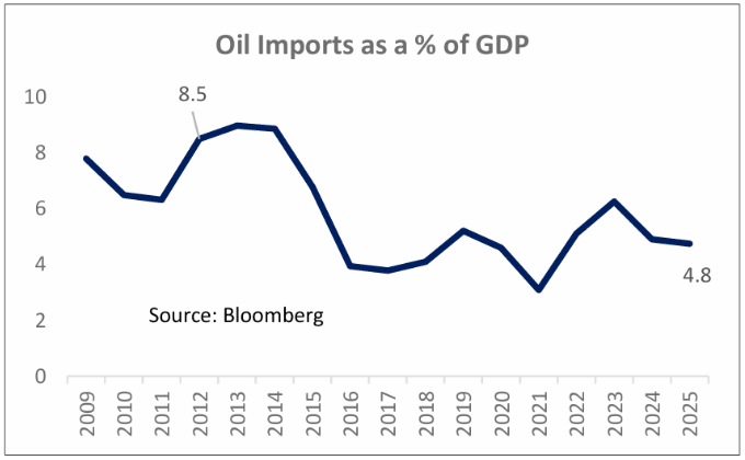 India is a major importer of energy products and a rise in price at this scale has the potential to bring the entire country to a grinding halt. Crude oil remains an important macro variable for India; however, structural improvements over the past decade have significantly reduced the economy’s sensitivity to oil price shocks. Oil imports as a share of GDP have declined from ~8.5% to ~4.8%, reflecting faster overall economic growth, improved energy efficiency and the gradual shift toward cleaner fuels and alternative energy sources.