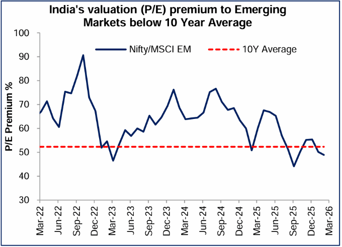 The geopolitical shock has triggered a classic risk-off environment across global markets. Developed markets, particularly the US, have shown relative resilience, while EMs have borne the brunt of outflows, reflecting higher sensitivity to global risk sentiment. The correction in Indian equities has broadly mirrored emerging markets in the recent risk-off phase. Notably, India had already underperformed peer EMs through 2025 due to trade concerns and elevated valuations. The recent decline has further compressed India’s valuation premium to EMs, bringing it below historical averages and improving its relative attractiveness. The NIFTY P/E has also come down from its long-term of ~22 to around 19.9 – indicating a good time to enter. However, it is always advisable to enter in a staggered manner with such heightened volatility.