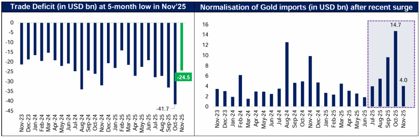 However, RBI intervened to stabilise the exchange rates a bit. Also, the trade deficit has narrowed and is at a five-month low. India’s external metrics improved meaningfully in November 2025 as Merchandise exports increased 19.4% year-on year to $38.1bn, while imports contracted 1.9% to $62.7bn, compressing the goods trade deficit to $24.5bn, the lowest since Jun-25 and far below record $41.7bn gap of Oct-25. The correction was driven by normalisation in gold and silver imports following festive-season front‑loading, alongside stable oil imports.