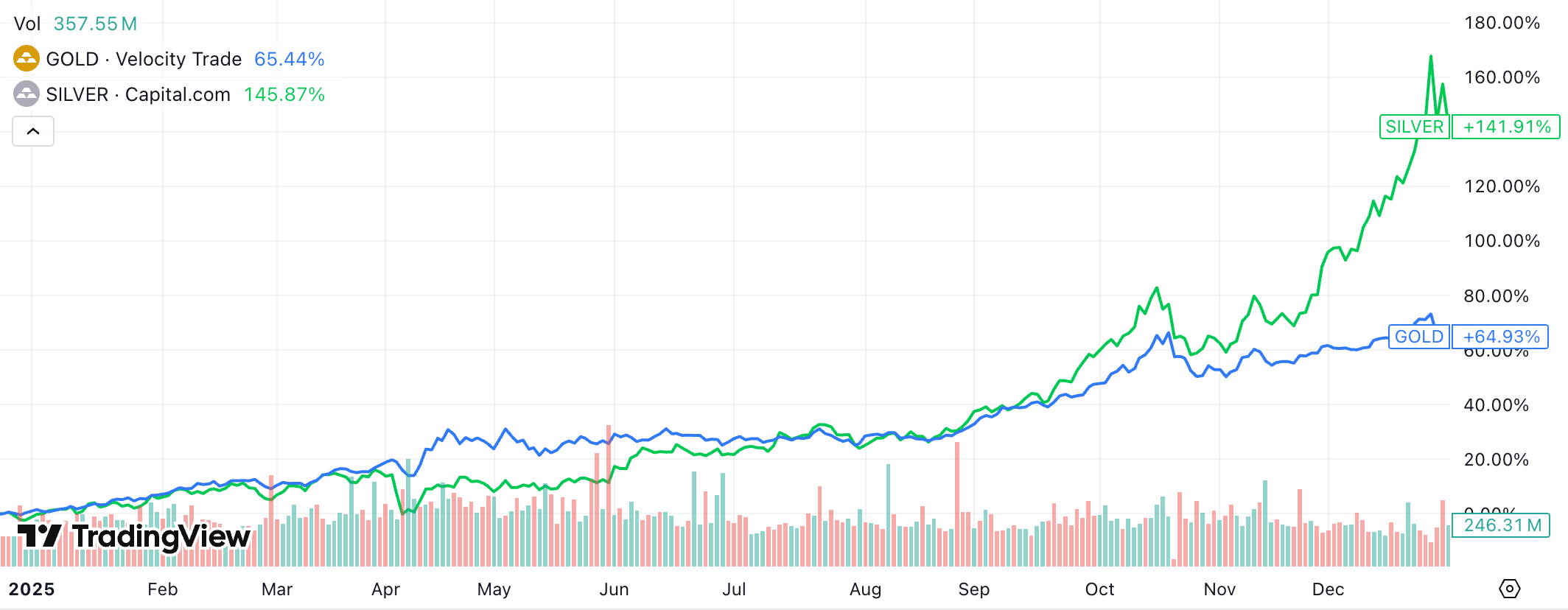 Gold and Silver continued their dream run and shattered all the records. This was the best year on record for these metals since 1970. An almost one-sided rally giving around 65% and 142% returns respectively for the year ending 2025.