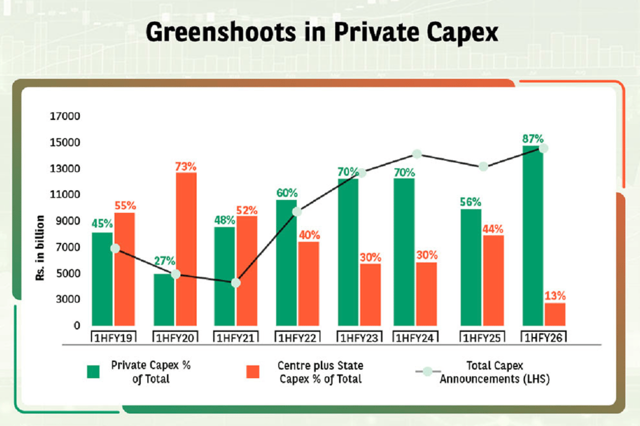 Private CapEx has been another talking point – it is viewed as a crucial metric that can contribute significantly to the economic growth. It has been a laggard of late, but green shoots are starting to emerge which can be a good sign. Capex expansion is becoming broad-based, with the count of companies with >US$100 million annual CapEx and the cumulative CapEx rising to 169 and US$131 billion by end of Sep’25 respectively, which is close to the levels last witnessed in 2011-12. During this time, the corporate CapEx expansion has predominately been in sectors like industrials, autos, metals and consumption, energy, utilities and healthcare. IIP growth was also at 6.7%.