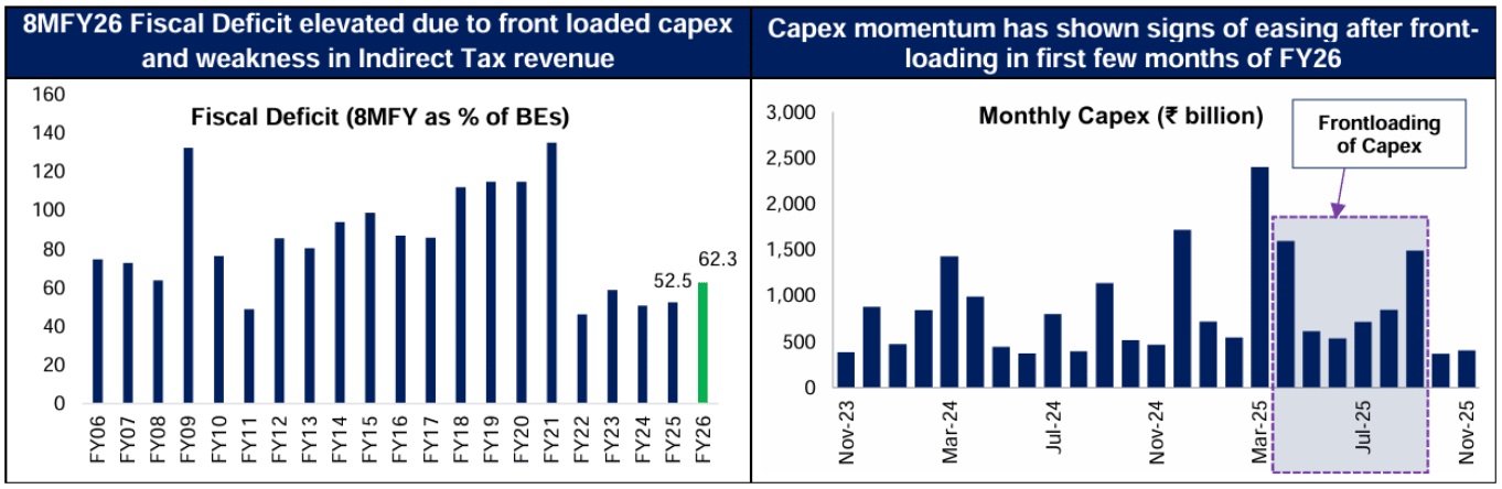 On the macro front, the Monetary Policy Committee (MPC) decided to keep the policy repo rate unchanged at 5.25% and retained the ‘neutral’ policy stance. Retail CPI Inflation was at 2.75%. The Government also announced that they were able to achieve the fiscal deficit target of 4.4% and have set a new target of 4.3% for FY27. Fiscal consolidation is also on track: revenue spending restraint, easing capex pace and strong non‑tax revenues significantly limit risks of fiscal slippage for FY26.