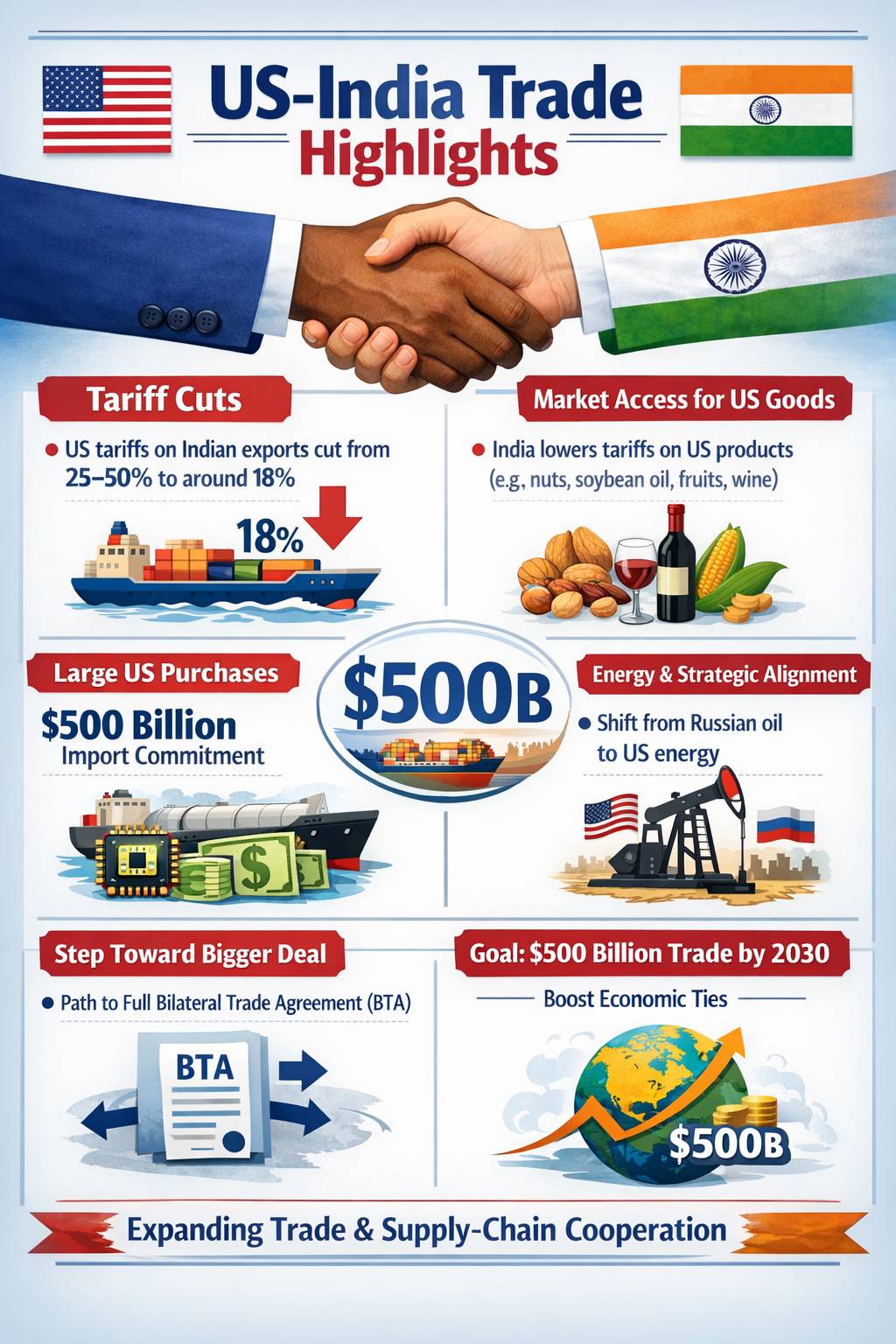 Energy & strategic alignment: India agreed to reduce dependence on Russian oil and shift more energy purchases toward the US and partners.