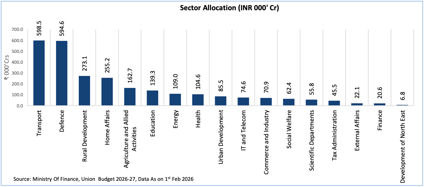 This month started with one of the most important events of the fiscal year – The Union Budget, presented against a backdrop of sustained macroeconomic stability but uncertain global environment. India’s Real GDP growth remains remain resilient around 7%, supported by fiscal discipline, moderate inflation and a consistent emphasis on public investment. FY27 GDP is estimated to grow at 6.8%-7.2%. Budget focused on the following points: